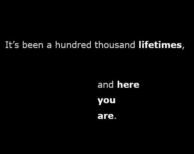 As someone who wholeheartedly believes in reincarnation (and believes in something like fate only somewhat hopefully) the endings in this are beautifully done. And I've got to say I love that you incorporated a choice - and a tough one - instead of having it all work towards one ending, yet still maintained this strong current of fate. Who says fate is just a straight path we walk on, instead of a branching river. Who says fate determines what we do, instead of what we do determining fate? Rivers change the landscapes around them after all. Anyways, I'm rambling. AMAZING job, this and your other work all have incredible thought and skill put into them.